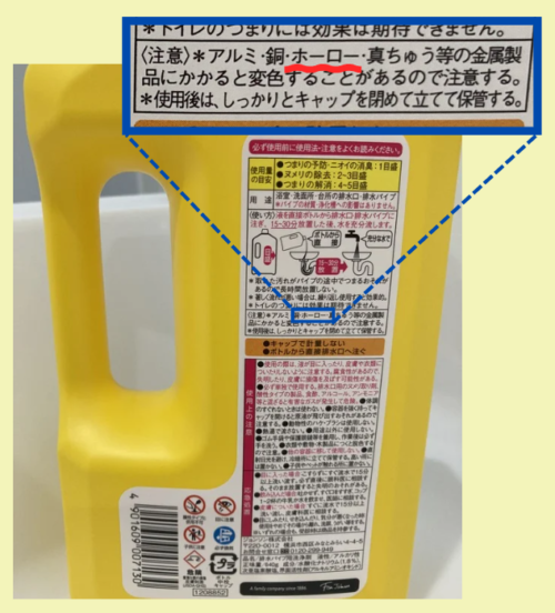 それからパイプユニッシュは塩素系で「ホーローにかかると変色することがある」とあるが排水口にホーローは使われていない。