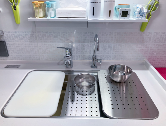 汚れが即落ちのパネルと引出し、アクリル人大の天板。作業スペースが増やせるシンク。