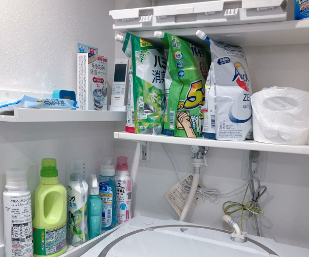 ストックばかり、洗濯洗剤やシャンプー、パイプユニッシュや箱買い歯ブラシなどを収納。